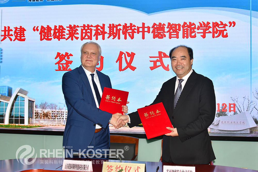莱茵科斯特董事长Eric·Moskwa(艾瑞克·莫斯卡瓦)先生与苏州健雄职业技术学院合作教育处长周三庆共同签署共建战略合作协议。校企双方将在江苏省高等职业教育产教融合集成平台——中德智慧制造双元制教育产业园内合作共建健雄莱茵科斯特中德智能学院。