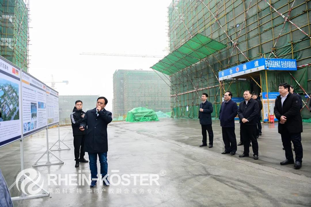 2020年12月2日上午,淄博经济开发区党工委书记、管委会主任张承友带领淄博经开区考察团一行43人到山东省重点外资项目——中德智能制造产教融合示范基地(中德工业物联网研发制造基地)施工现场实地考察项目建设情况。淄博高新区工委副书记、管委会常务副主任郑良宪,高新区工委、管委会办公室主任王飞,高新区经济发展局局长张家奎等相关部门主要负责同志陪同考察。莱茵科斯特总经理崔智、副总经理阎永嘉接待考察并汇报项目建设情况。