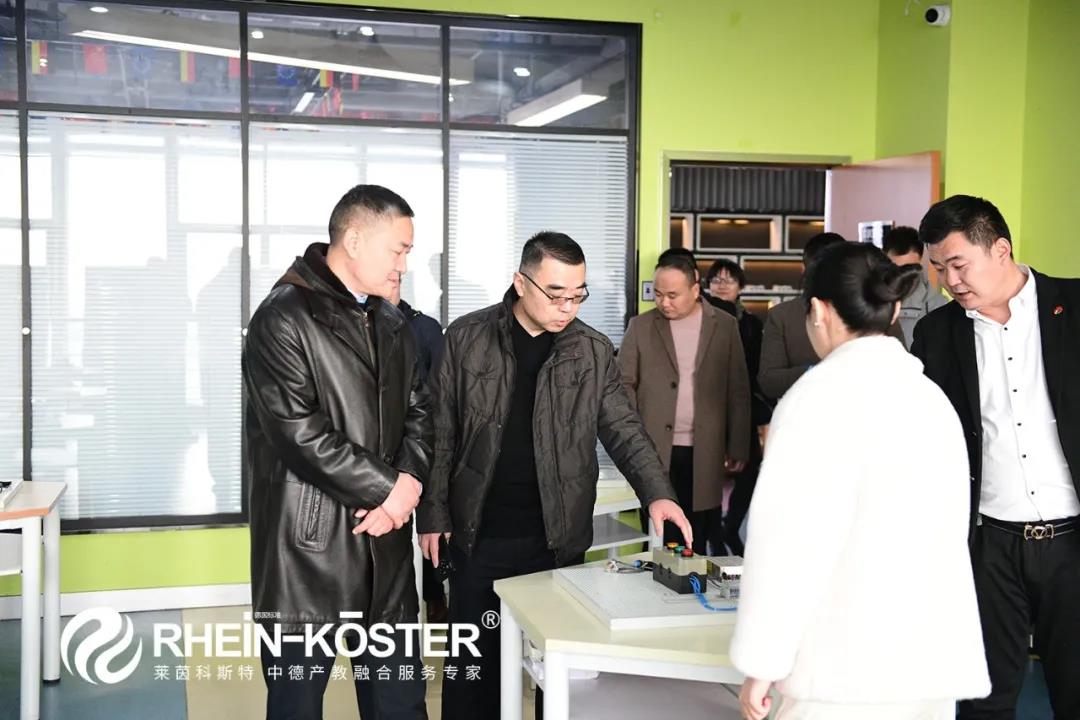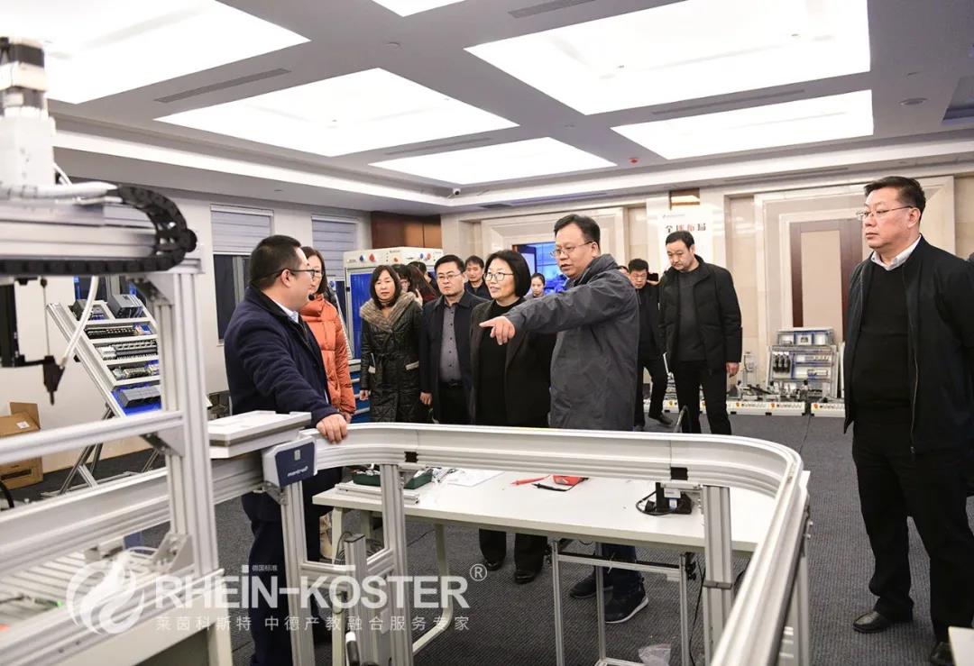 2020年12月9日下午,淄博职业学院党委副书记、院长杨百梅,党委委员、副院长高霞,党委委员、宣传统战部部长张成山,教务处处长贾艳萍,“双高”办主任王美芬,资产处处长李荣,财务处处长张振沂,创新创业学院院长胡业冰,机电工程学院院长潘学海、副院长李万军等一行11人莅临莱茵科斯特双跨培训中心暨中德智能制造技术公共服务平台考察调研。莱茵科斯特总经理崔智、副总经理陈朋、副总经理刘大力、教育事业部部长王洪磊、项目总监王伟等陪同调研。