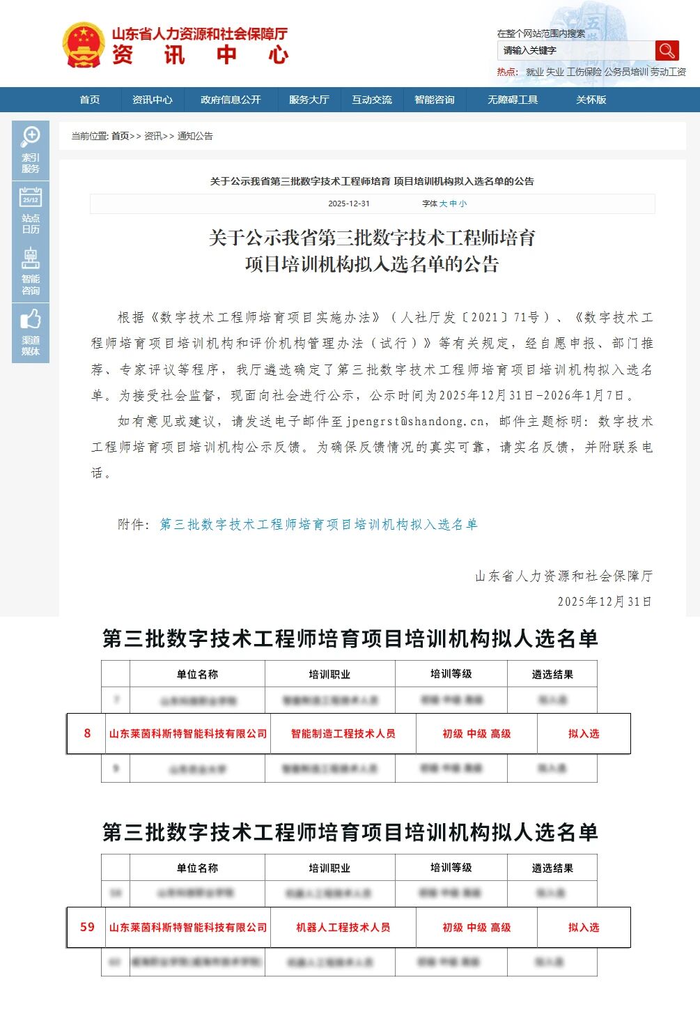 Recently, the Shandong Provincial Department of Human Resources and Social Security announced the proposed list of training institutions for the third batch of the Digital Technology Engineer Cultivation Program. Following municipal-level preliminary review, on-site evaluation by the provincial expert group and public announcement, Shandong RheinKoester Intelligent Technology Co., Ltd. has successfully obtained two training qualifications for Intelligent Manufacturing Engineers and Robotics Engineers, by virtue of its solid professional foundation, advanced practical training conditions, international teaching faculty and systematic and feasible talent cultivation plans.