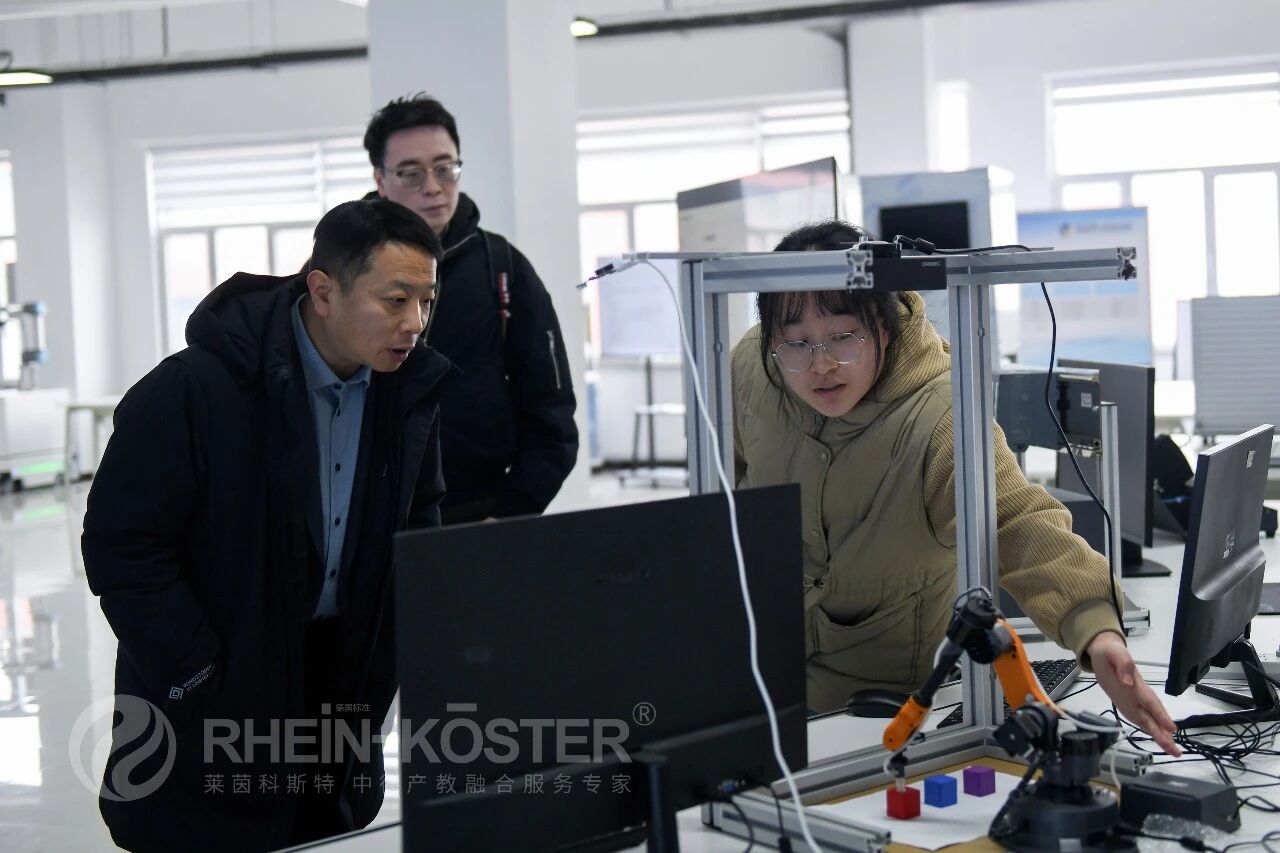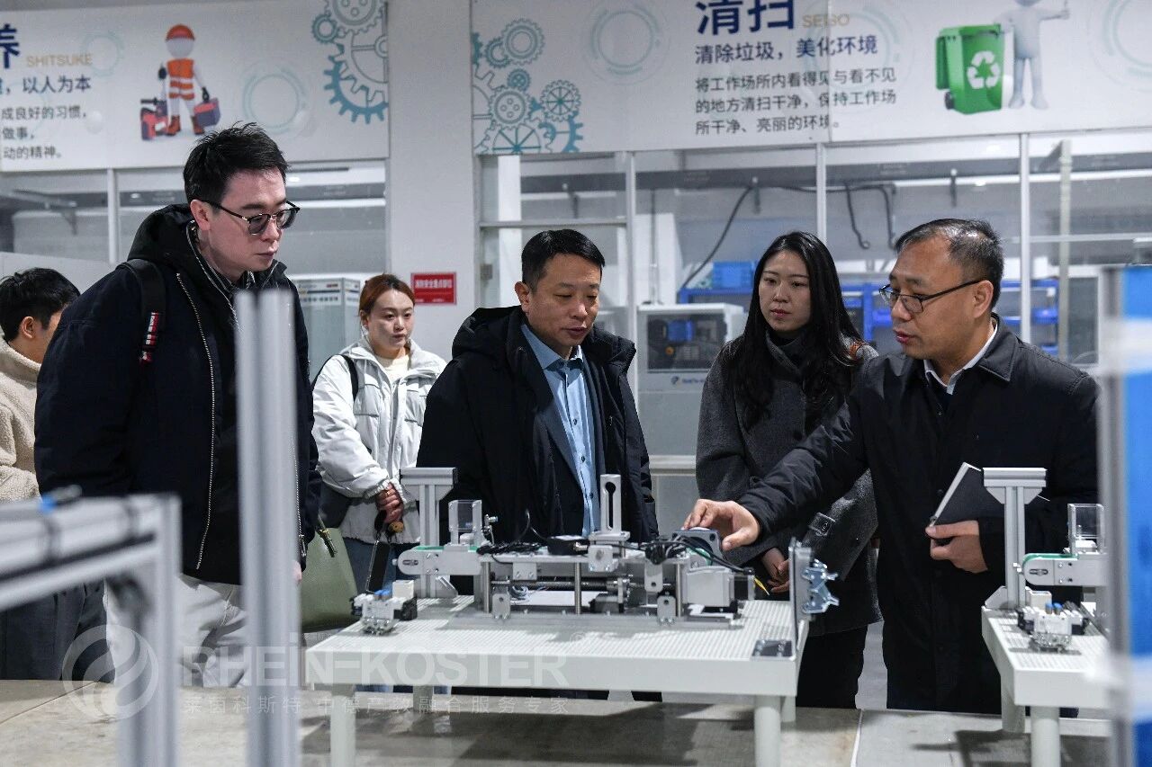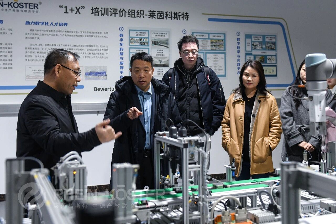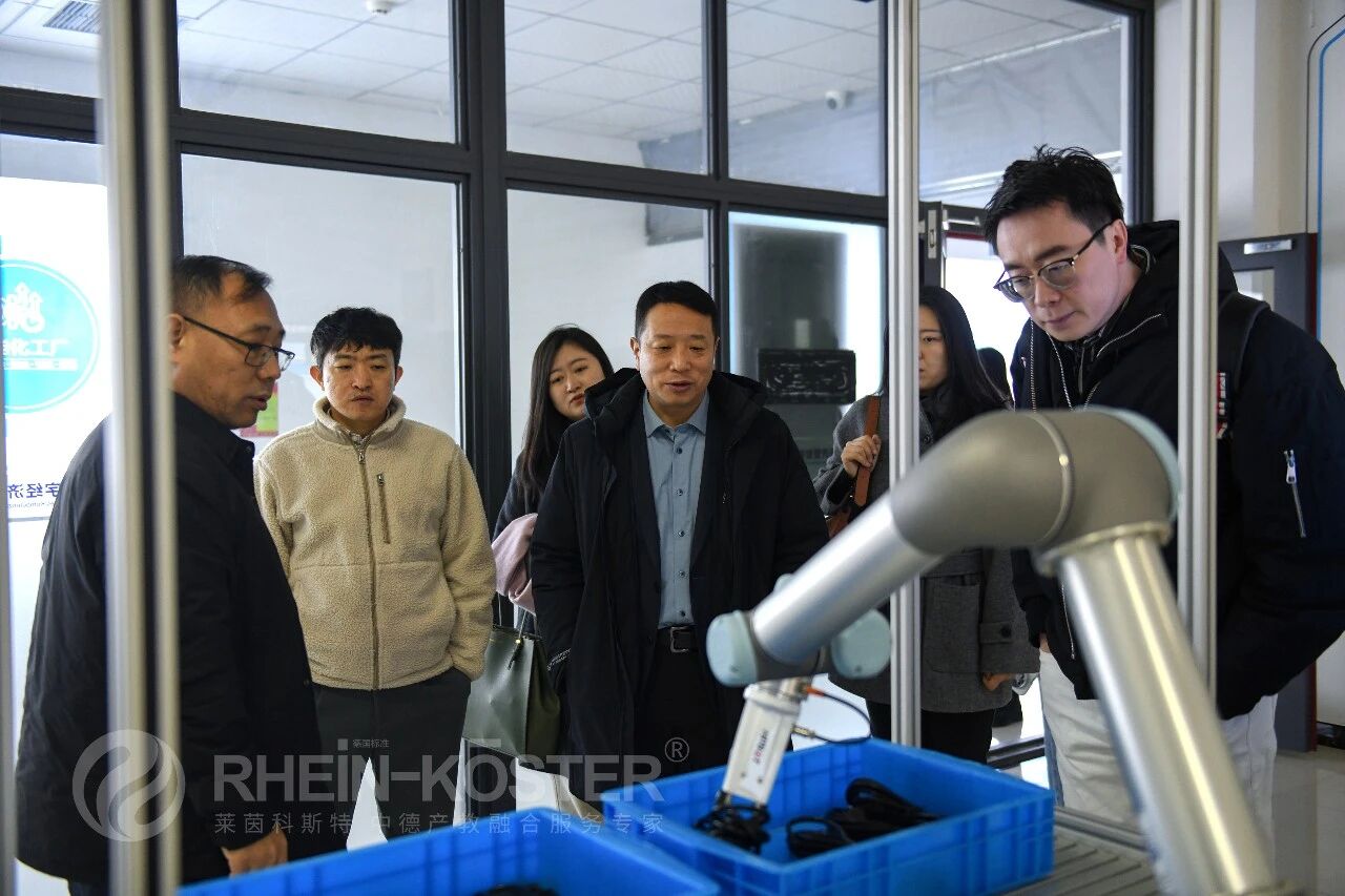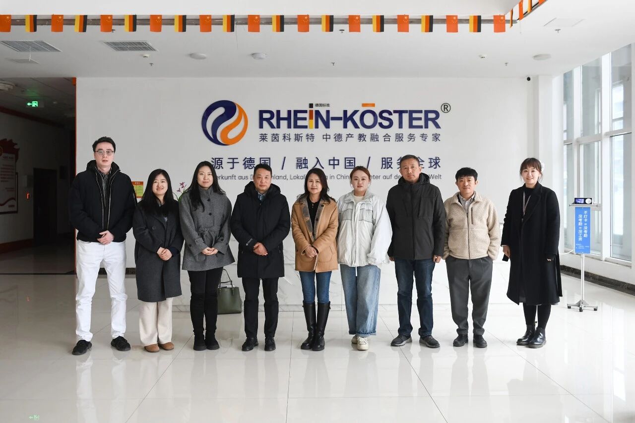 The visiting leaders and their delegation first toured the China-Germany Intelligent Manufacturing Industry-Education Integration Demonstration Base constructed and operated by RheinKoester. They listened carefully to the detailed briefing on the base’s construction background, development history and operation model, and conducted an on-site observation of the teaching scenes of programs such as RheinKoester’s Integrated Program for Study in Germany and Employment and the “AI + Sino-German Rhein Intelligent Craftsman Class”, as well as the ongoing situation of the special double selection fair for the employment of graduated students.