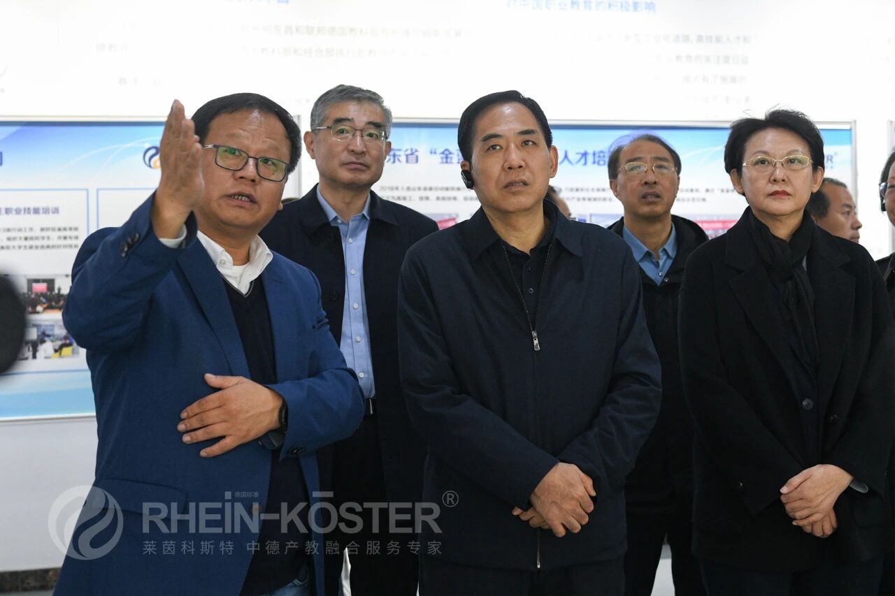2025年10月26日,在第九届山东省黄炎培职业教育创新创业大赛即将拉开帷幕之际,山东省委统战部副部长孙中亮、省中华职教社专职秘书长程海峰率大赛观摩团一行到中德智能制造产教融合示范基地开展实地调研。观摩团成员主要由来自全省各市的中华职教社及统战系统相关负责人组成,旨在通过赛前走访,深入了解我省职业教育与产业融合发展的创新实践。淄博市委常委、统战部部长盖卫星,市政协副主席、民建市委会主委、市中华职教社主任马靖,淄博高新区工委书记、管委会主任王晓东等领导陪同调研。莱茵科斯特董事长崔智、培训师学院院长胡鹏昌等公司领导接待并介绍相关情况。