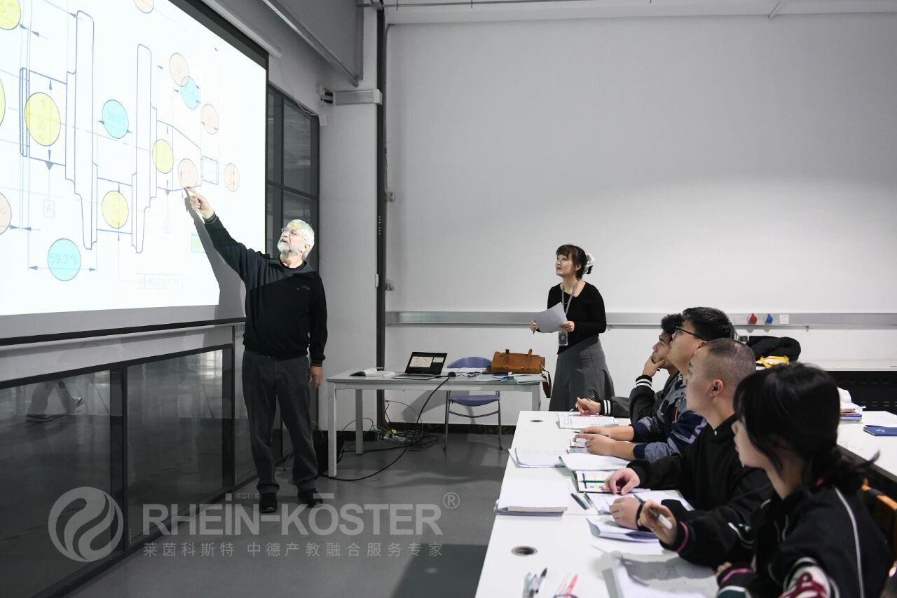 作为工业机械领域的资深专家,Gerhard Haag先生此行的重点之一,是与莱茵科斯特机械专业培训师团队开展深入的教学交流。他结合德国职业教育标准与本土教学实际,协助项目团队进一步完善工业机械工职业方向的教学大纲,使大纲更贴合德国行业需求与学员发展实际。