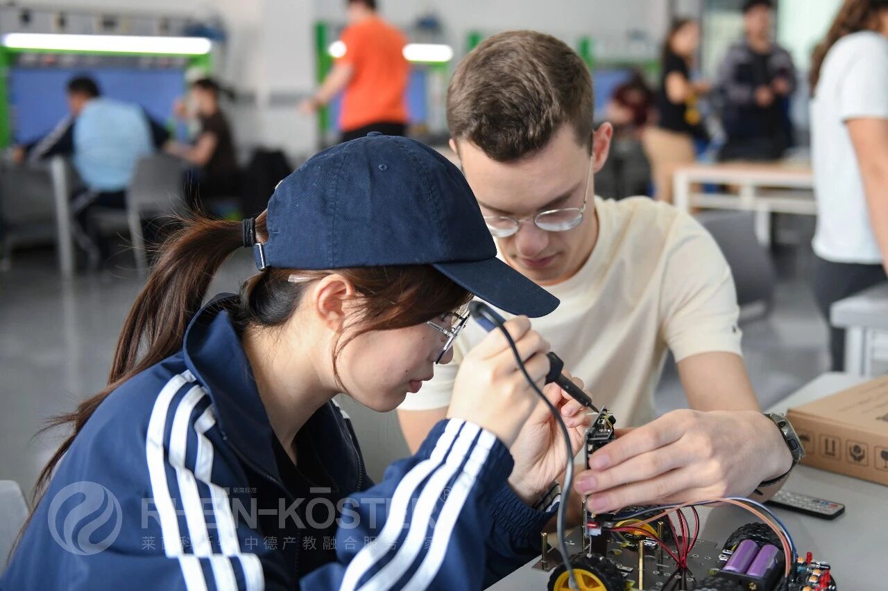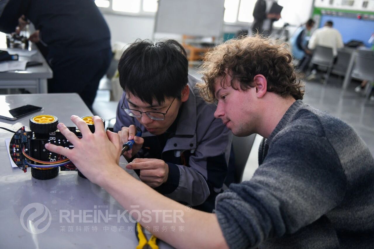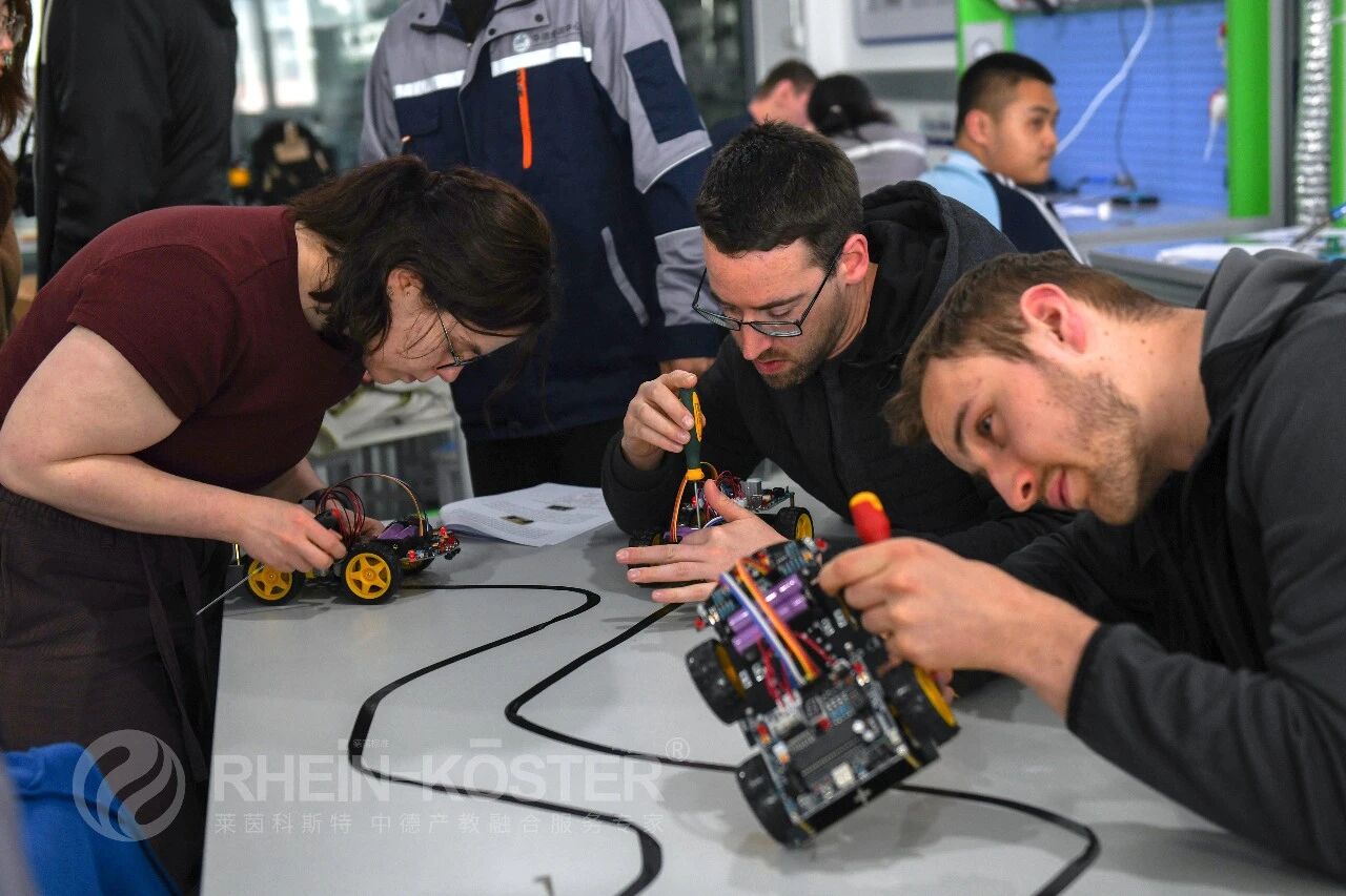 2026年3月26日,来自德国巴伐利亚技术学院的技术员学访团,与莱茵科斯特“赴德培训就业一体化项目”学员开展联合实训,双方围绕四轮驱动智能控制车实训项目展开深度协作。此次实训是中德职业教育交流的务实举措,依托莱茵科斯特智能制造实训平台,搭建起跨国技术学习、经验共享的桥梁,推动德国双元制职教理念与本土实操教学深度融合,助力参训学员夯实电气控制、智能装备调试核心技能,也为两国技术人才交流搭建了实践载体。