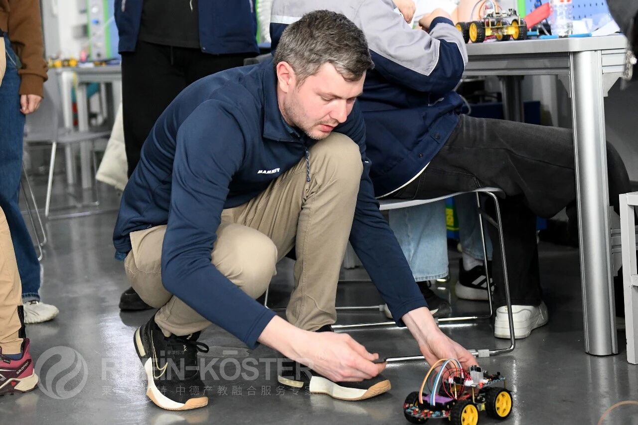 实训以小组形式展开,每组由德方技术员与中方学员混合编队。课程核心任务是完成一辆四轮驱动智能控制车的电气系统安装与调试。双方学员共同研读技术图纸,进行电气元件的选型、线路敷设与控制器接线。过程中,德方技术员介绍了德国工业环境下的标准操作流程与故障排查思路,中方学员则展示了在前期课程中掌握的技能,双方就技术细节进行了研讨与实操。