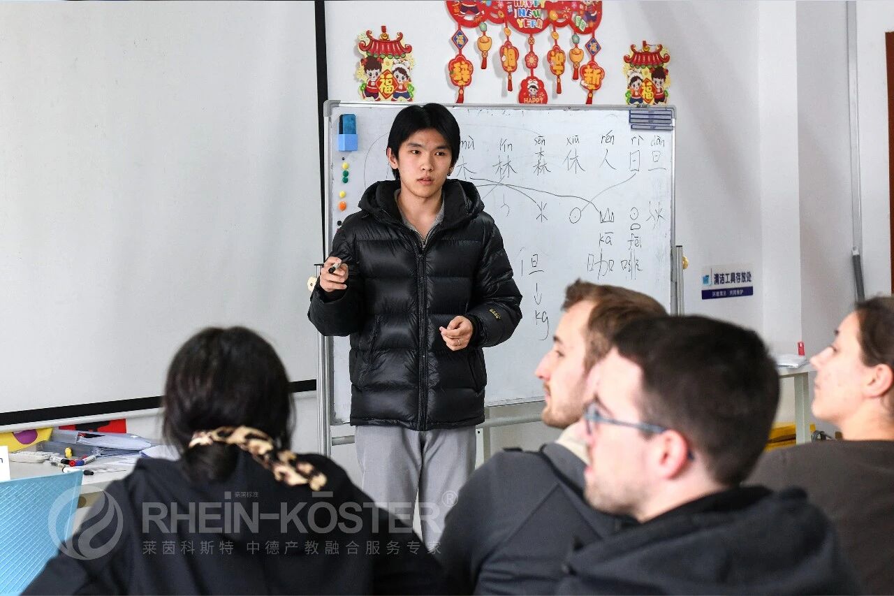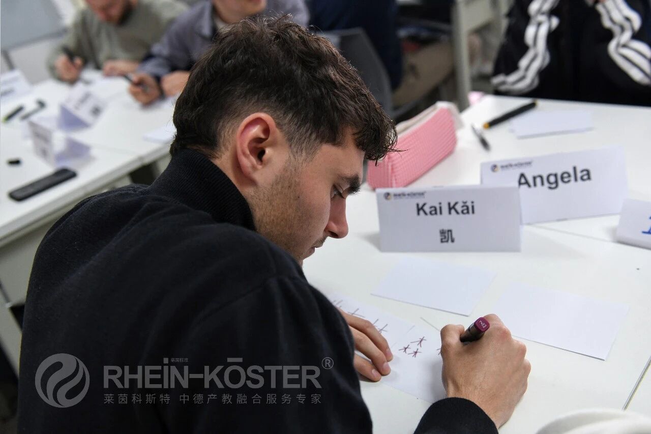 来自莱茵科斯特“赴德培训就业一体化”项目的在读学员担任文化志愿讲解员,为德国技术员们带来了一堂趣味汉语基础教学与国风书法体验课。课堂上,中方学员从教他们念读自己的中文名开始,逐步引导大家认识基础汉字的字形结构,并尝试让他们动手描摹。在象形字的讲解环节,中方学员通过图文并茂的方式展示汉字演变过程,让德方人员在趣味互动中感知汉字的造字智慧与文化意涵。